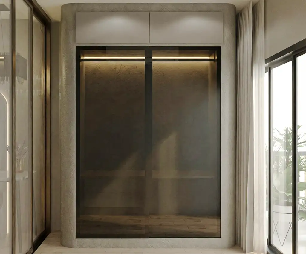 3. Urban Reflection & Glow (แสงเงาและเงาสะท้อนแห่งเมือง) การใช้วัสดุกระจกใสและกระจกสีเข้ม (Black Tinted Glass) ตัดกับความด้านของผนังปูน ผสานกับการจัดแสงไฟ Indirect Light ที่นุ่มนวล สร้างบรรยากาศที่ดูลึกลับแต่น่าค้นหา เหมือนเสน่ห์ของลอนดอนยามค่ำคืน