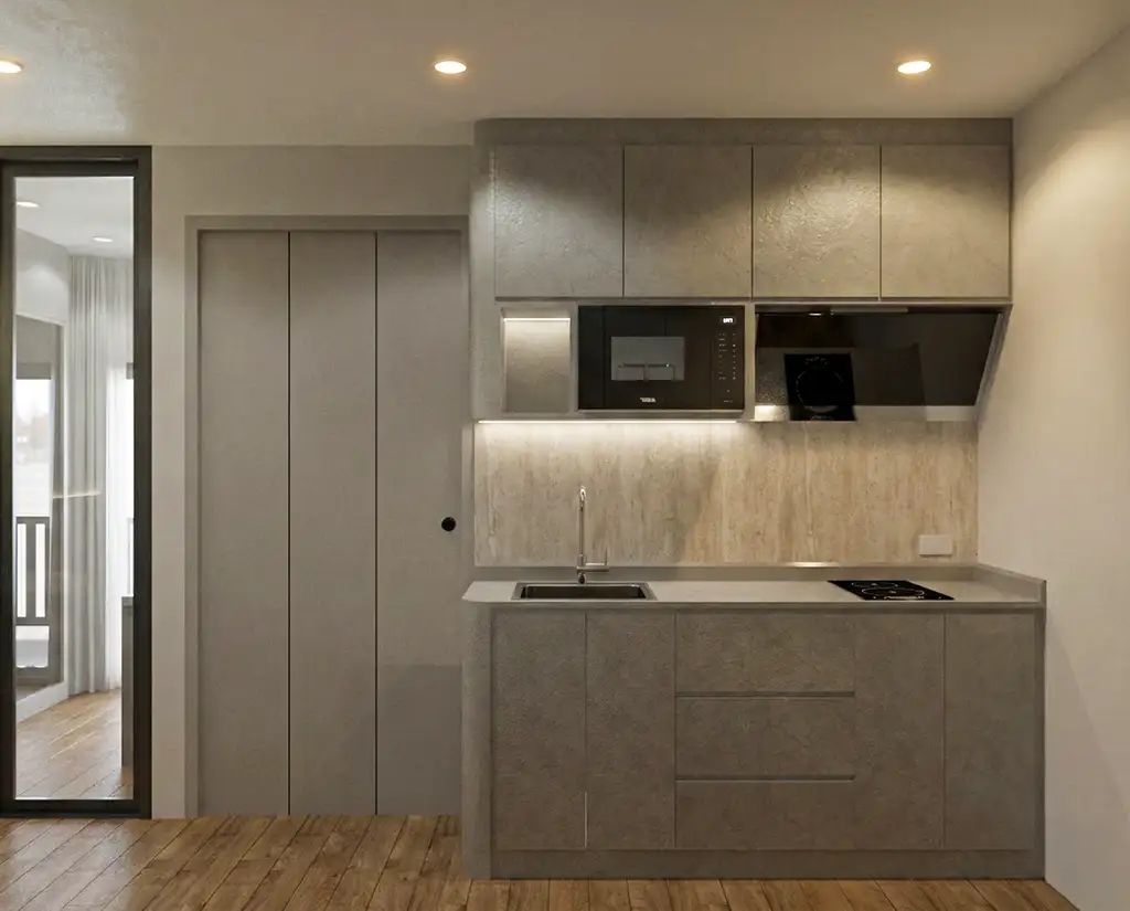 2. Geometric Layering (เรขาคณิตแห่งระนาบที่ซ้อนชั้น) นิยามความอ่อนโยนแบบใหม่ที่ไม่พึ่งพาเส้นโค้ง แต่ใช้ “การซ้อนทับของระนาบสี่เหลี่ยม” (Rectangular Layers) และเส้นสายที่ตรงไปตรงมา มาจัดวางให้เกิดมิติความลึกตื้น (Depth) เปรียบเสมือนเลเยอร์ของกลีบดอกไม้แบบกราฟิกที่ค่อยๆ ซ้อนตัวกัน การเล่นระดับของตู้ลอยและชั้นวางช่วยลดทอนความทึบตันของทรงสี่เหลี่ยม ทำให้สเปซดูโปร่ง เบา และเฉียบคมในเวลาเดียวกัน