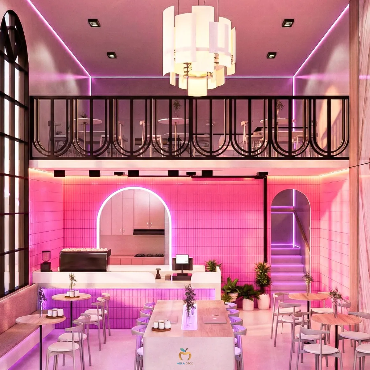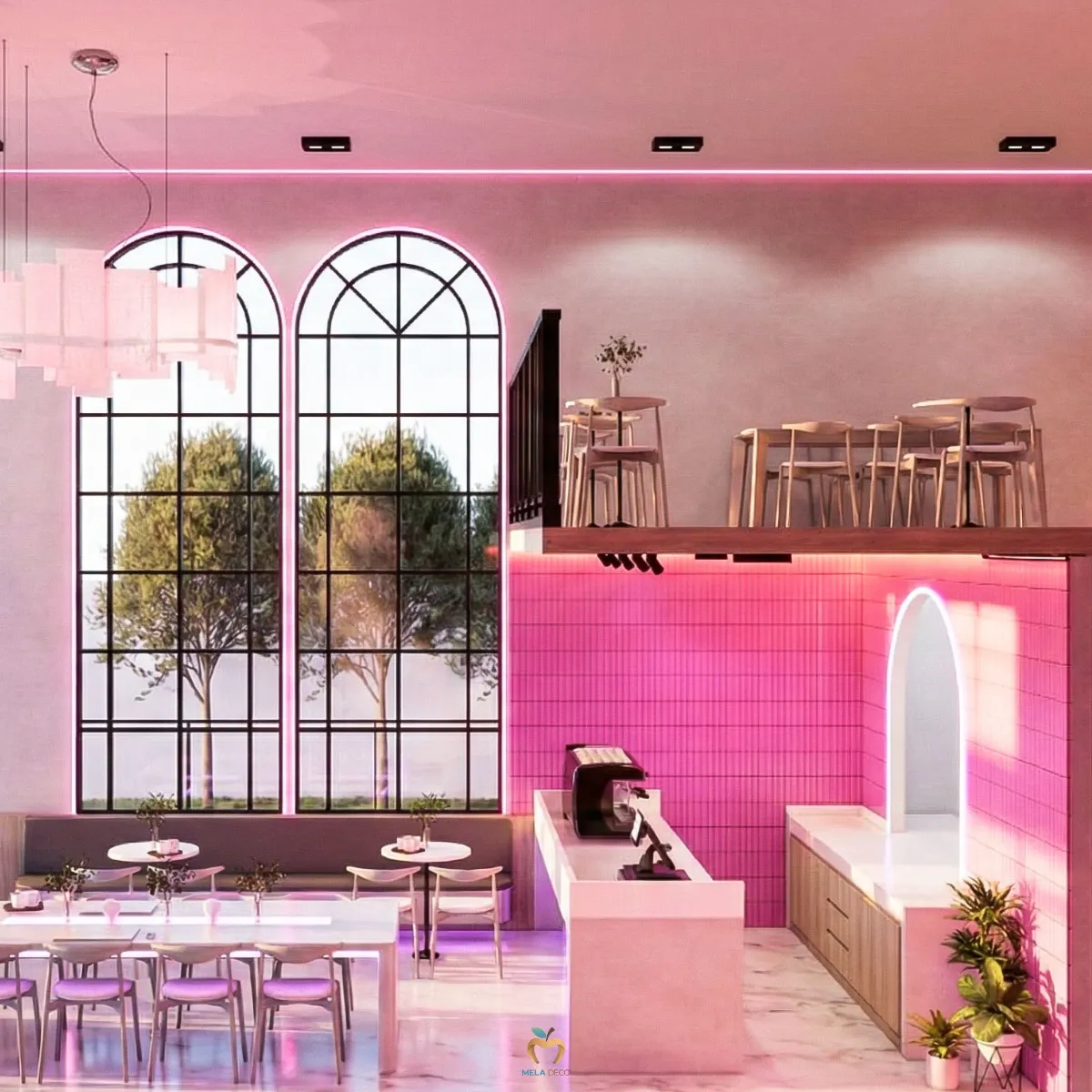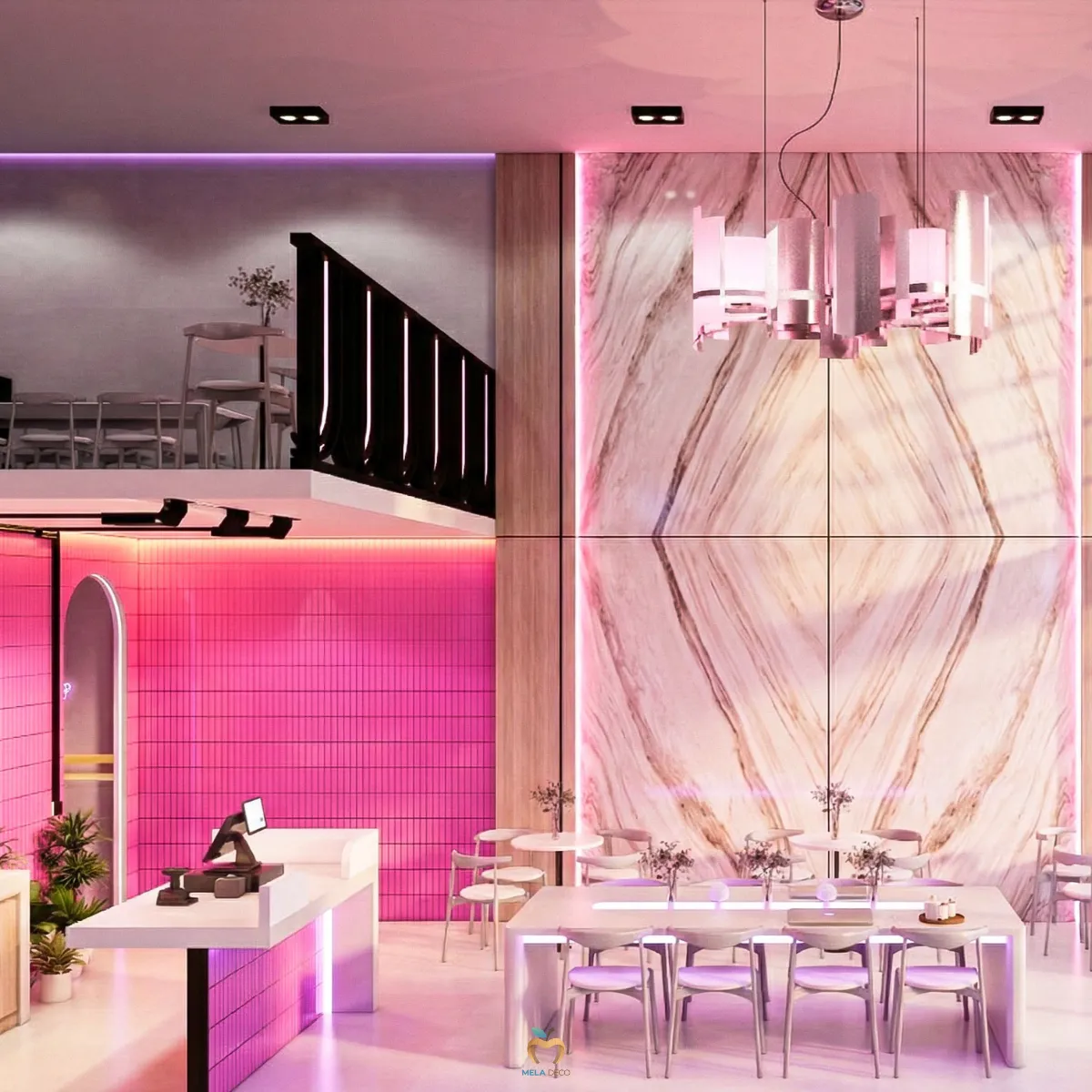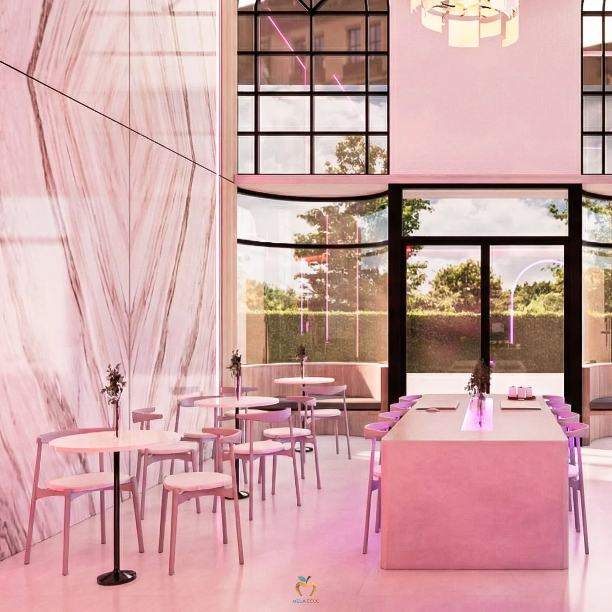 Seoul Pop Beam คือพื้นที่ที่รวมความดิบ ความสด ความหรู และความล้ำไว้ด้วยกันอย่างสมดุล เหมาะสำหรับแบรนด์ที่ต้องการความโดดเด่นเป็นที่จดจำและต้องการก้าวขึ้นเป็นผู้นำเทรนด์ในโลกของคาเฟ่ยุคใหม่ จุดเด่นของดีไซน์อยู่ที่การนำวัสดุที่มีความขัดแย้งมาสร้างความสมดุล เช่น Industrial Concrete, Neon Pink, Glossy Tiles, Bookmatch Marble และ Stainless Steel เพื่อสร้างพื้นที่ที่ทั้งโดดเด่น ทันสมัย และมีเอกลักษณ์ชัดเจน เหมาะกับแบรนด์ที่ต้องการสร้างภาพจำและเป็น Trendsetter ในตลาดคาเฟ่ยุคใหม่ ผ่านงานบิ้วอินที่ Mela Deco ตั้งใจออกแบบ Mood & Tone ของพื้นที่ให้ต่อเนื่องทั้งร้าน สำหรับผู้ประกอบการที่ต้องการสร้างคาเฟ่ที่มีตัวตนชัดเจน สามารถพัฒนาแนวคิด Seoul Pop Beam ให้เหมาะกับแบรนด์ของตัวเองได้ Mela Deco สามารถดูแลตั้งแต่การออกแบบ Concept ไปจนถึงการผลิตและติดตั้งจริงให้ผู้ประกอบการทุกท่านได้ค่ะ