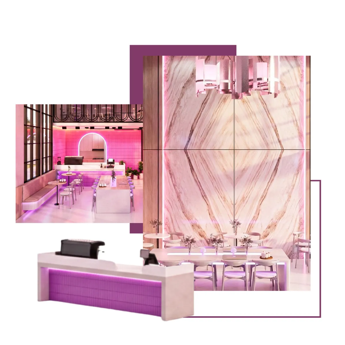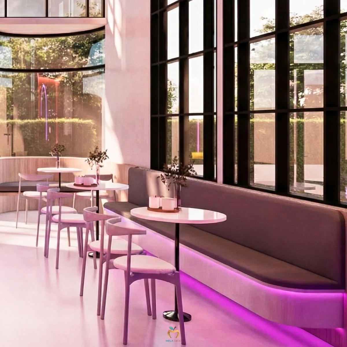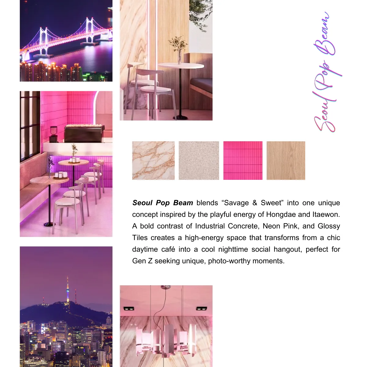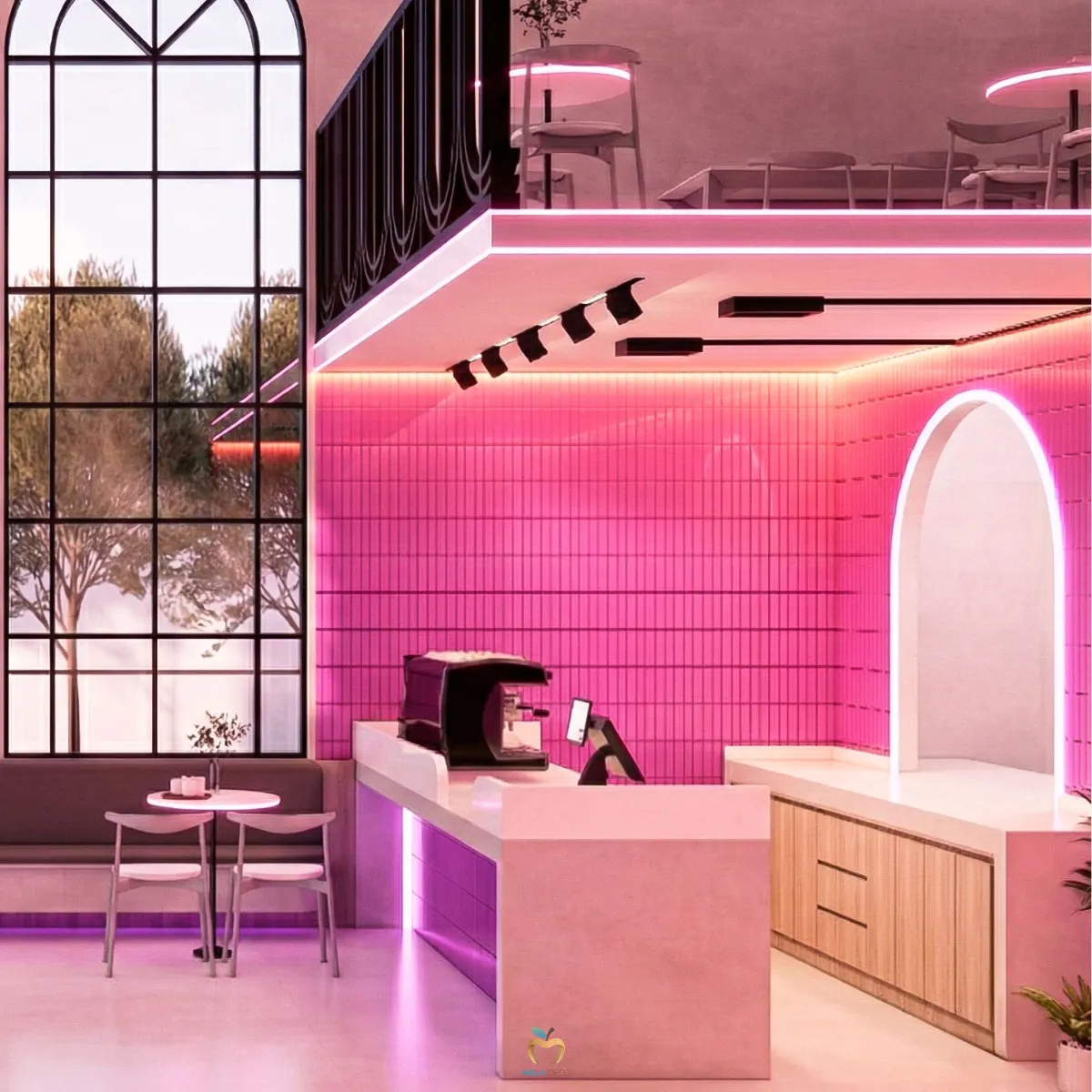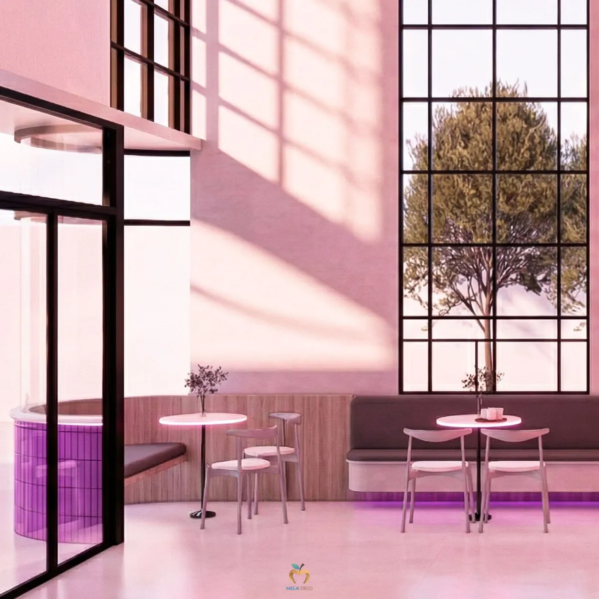 Seoul Pop Beam คือพื้นที่ที่รวมความดิบ ความสด ความหรู และความล้ำไว้ด้วยกันอย่างสมดุล เหมาะสำหรับแบรนด์ที่ต้องการความโดดเด่นเป็นที่จดจำและต้องการก้าวขึ้นเป็นผู้นำเทรนด์ในโลกของคาเฟ่ยุคใหม่ จุดเด่นของดีไซน์อยู่ที่การนำวัสดุที่มีความขัดแย้งมาสร้างความสมดุล เช่น Industrial Concrete, Neon Pink, Glossy Tiles, Bookmatch Marble และ Stainless Steel เพื่อสร้างพื้นที่ที่ทั้งโดดเด่น ทันสมัย และมีเอกลักษณ์ชัดเจน เหมาะกับแบรนด์ที่ต้องการสร้างภาพจำและเป็น Trendsetter ในตลาดคาเฟ่ยุคใหม่ ผ่านงานบิ้วอินที่ Mela Deco ตั้งใจออกแบบ Mood & Tone ของพื้นที่ให้ต่อเนื่องทั้งร้าน สำหรับผู้ประกอบการที่ต้องการสร้างคาเฟ่ที่มีตัวตนชัดเจน สามารถพัฒนาแนวคิด Seoul Pop Beam ให้เหมาะกับแบรนด์ของตัวเองได้ Mela Deco สามารถดูแลตั้งแต่การออกแบบ Concept ไปจนถึงการผลิตและติดตั้งจริงให้ผู้ประกอบการทุกท่านได้ค่ะ