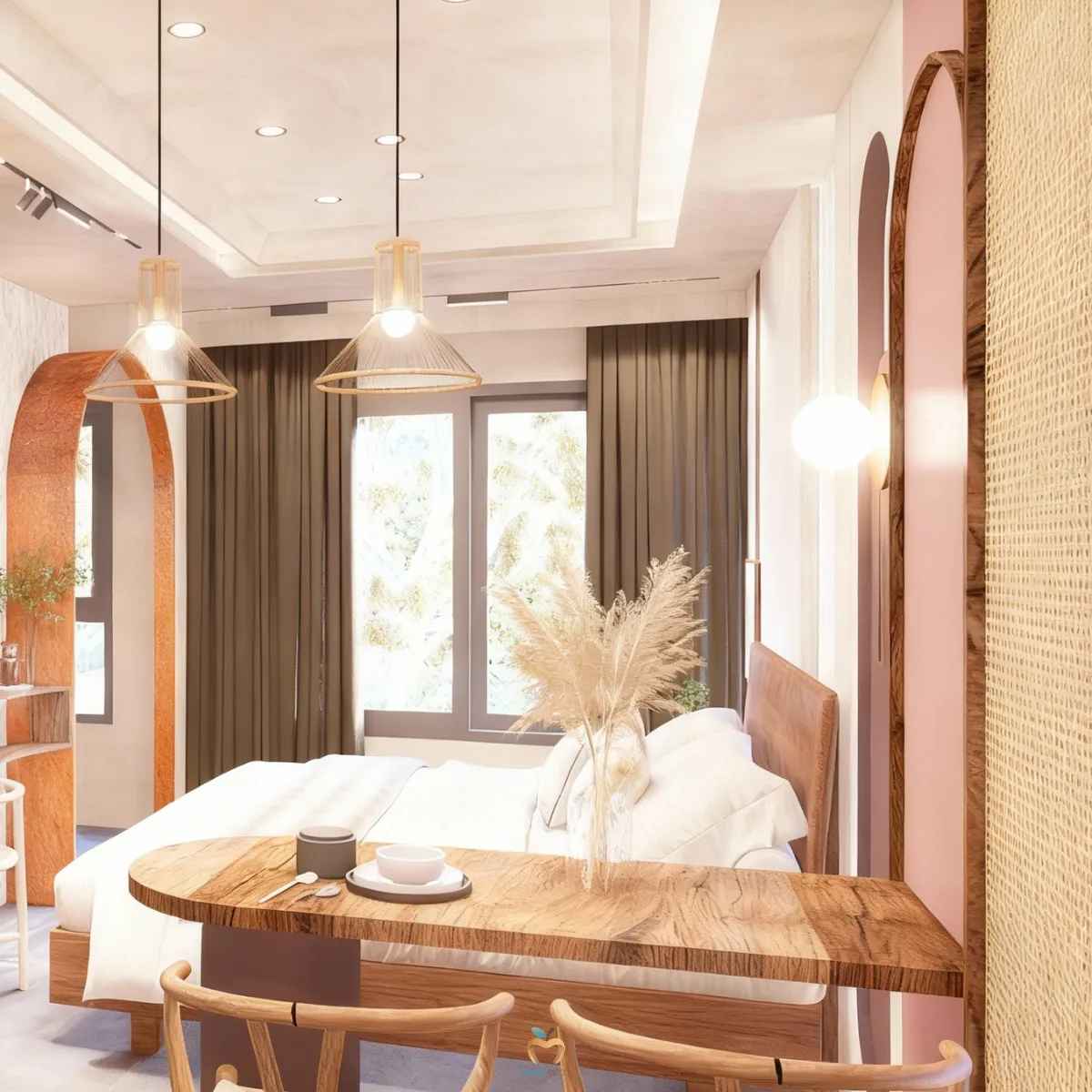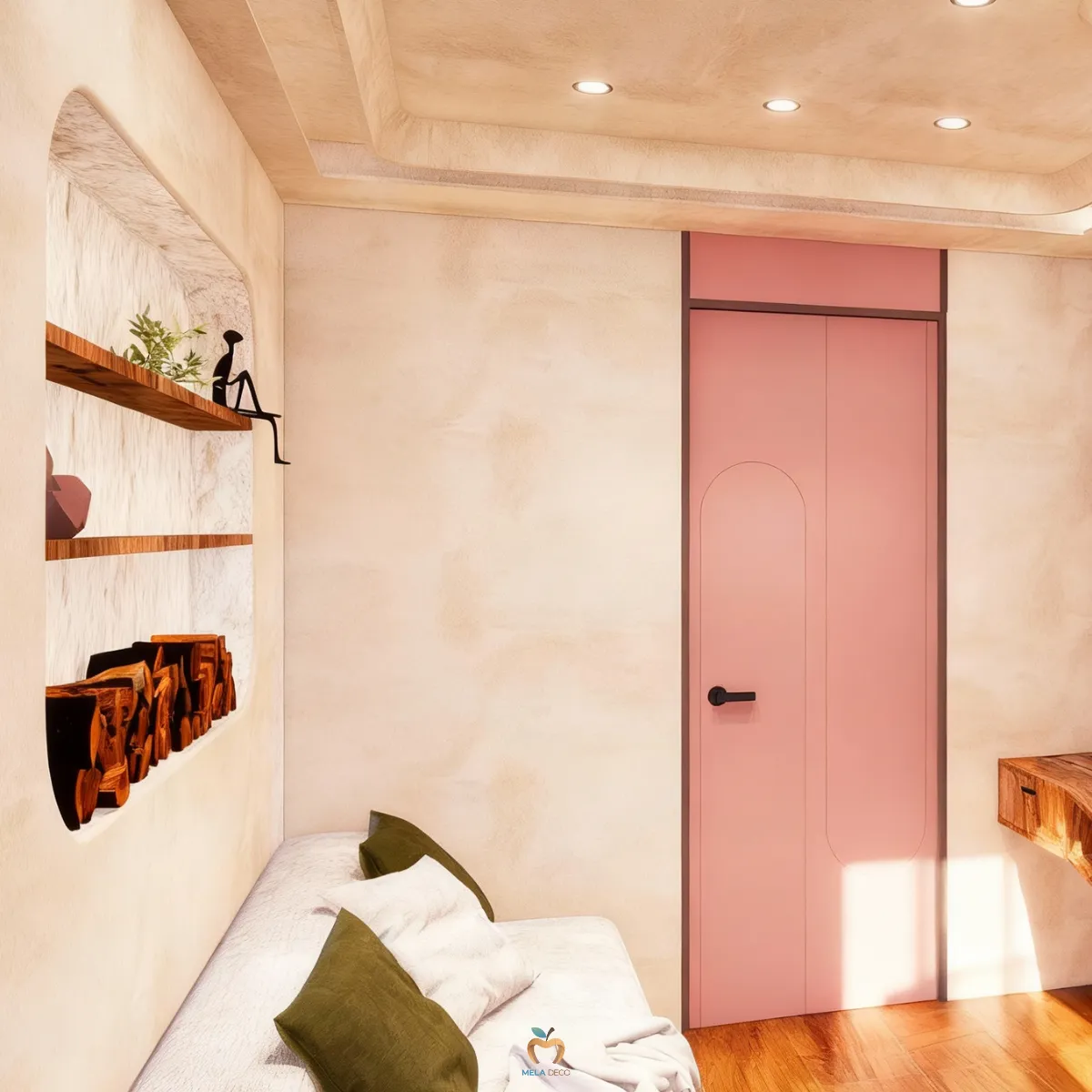 Terra Cotta Verse คือบทกวีที่ถ่ายทอดความอบอุ่นของธรรมชาติผ่านงานบิ้วอินและการออกแบบภายในอย่างมีชั้นเชิง แรงบันดาลใจเกิดจากช่วงเวลาที่ดิน ไม้ และแสง มาบรรจบกันอย่างกลมกลืน ไม่ใช่เพียงการเลือกใช้วัสดุจากธรรมชาติ แต่คือการออกแบบให้ทุกองค์ประกอบสื่อสารถึงความสงบ ความอ่อนโยนและความเป็นบ้านอย่างแท้จริง เส้นสายของไม้ที่โค้งไหลอย่างเป็นอิสระ ผสานกับผนังโทนเทราคอตต้าและพื้นผิวที่ให้สัมผัสดุจดินปั้นแห้งในยามต้องแสงบ่าย ล้วนทำหน้าที่เป็นจังหวะที่ชวนให้ผู้อยู่อาศัยช้าลง หายใจลึกขึ้น และกลับมาเชื่อมต่อกับตัวเองอีกครั้ง Mela Deco ตั้งใจออกแบบให้พื้นที่แห่งนี้ไม่ใช่เพียงห้องพักอาศัยแต่คือการตีความคำว่าบ้าน ให้กลายเป็นพื้นที่แห่งการพักใจที่อบอุ่นเป็นธรรมชาติและมีชีวิตในทุกช่วงเวลาค่ะ