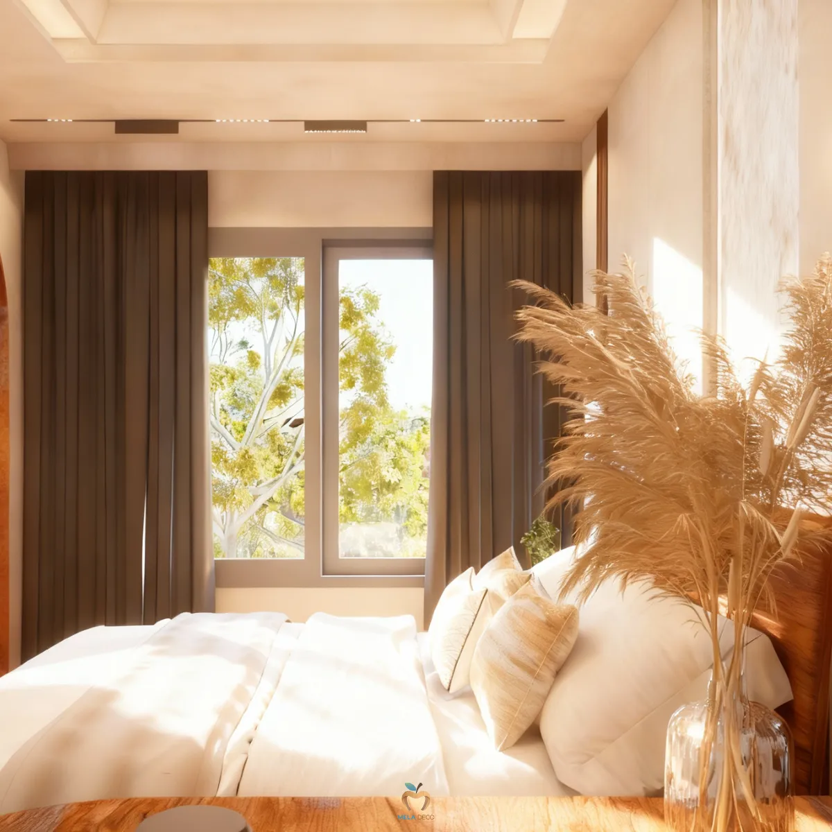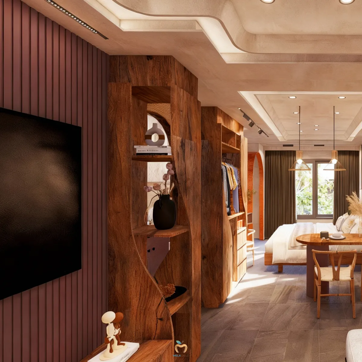 โทนสีคือหัวใจของ Terra Cotta Verse คือโทน Walnut Brown, Clay Beige และ Rosewood Accent ถูกนำมาจัดวางอย่างมีจังหวะ ผนังโทนอุ่นทำหน้าที่เป็นฉากหลังที่สงบ ในขณะที่ลายไม้ธรรมชาติช่วยเติมชีวิตและความลึกให้กับพื้นที่ การเลือกใช้สีไม่ได้ยึดติดกับเทรนด์แต่ยึดโยงกับความรู้สึกของมนุษย์ เพราะ Mela Deco เข้าใจดีว่าโทนสีเหล่านี้ช่วยลดความตึงเครียด สร้างความรู้สึกปลอดภัย และเหมาะกับการพักผ่อนในระยะยาว เราเลือกใช้วัสดุที่ให้ผิวสัมผัสจริง ไม่เรียบจนเกินไปเพื่อให้ทุกการมองเห็นและการสัมผัส มีความหมายและอบอุ่นอย่างเป็นธรรมชาติค่ะ