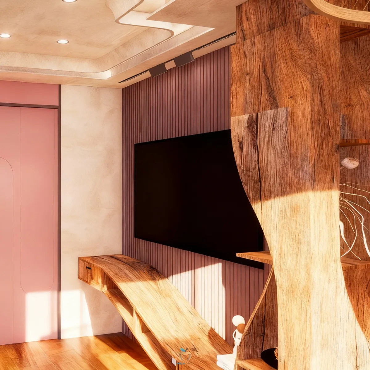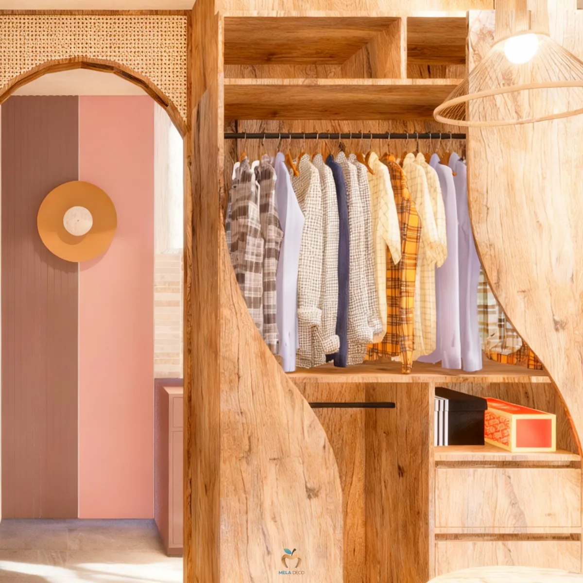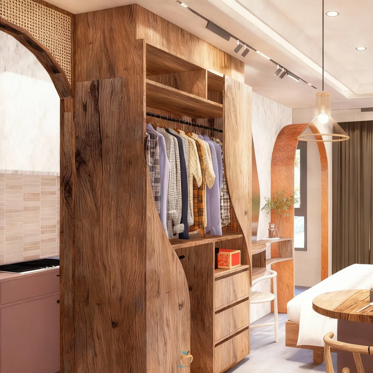 หนึ่งในเอกลักษณ์ของ Terra Cotta Verse คือการออกแบบบิ้วอินที่ลดทอนเส้นตรงแข็งกระด้าง แล้วแทนที่ด้วยเส้นโค้งอ่อนโยน ไม่ว่าจะเป็นช่องประตู บิ้วอินตู้เสื้อผ้า ผนังตกแต่ง หรือเฟอร์นิเจอร์ฟังก์ชันต่าง ๆ ซุ้มโค้งถูกออกแบบให้เป็นมากกว่าทางเดินหรือกรอบประตู แต่เป็นเสมือน transition ระหว่างพื้นที่ใช้งาน สร้างความรู้สึกต่อเนื่องและไหลลื่น สอดรับกับแนวคิดเรื่องความสงบและการพักผ่อน งานบิ้วอินไม้ถูกออกแบบให้มีมิติทั้งการเซาะร่อง การเล่นระดับ และการใช้ไม้แผ่นใหญ่แบบ natural edge ที่ยังคงรูปทรงดั้งเดิมไว้ ทำให้เฟอร์นิเจอร์แต่ละชิ้นไม่ใช่แค่ของใช้ แต่เป็นงานศิลป์ที่มีตัวตนในพื้นที่เพราะ Mela Deco ให้ความสำคัญกับการออกแบบเฉพาะตัวทุกสัดส่วนถูกคิดจากการใช้งานจริง และอารมณ์ของผู้อยู่อาศัยเป็นหลักเลยค่ะ